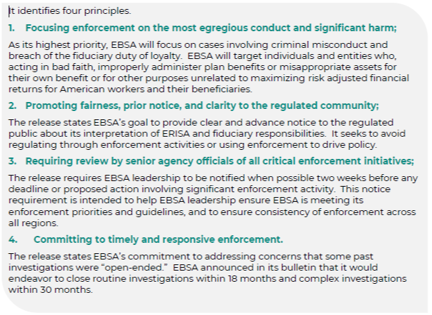 The release evidences EBSA’s intent to spend enforcement resources going after bad actors but not imposing undue burdens on retirement plans that seek to comply with ERISA.