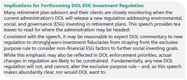 While welcome news for the regulated community, it may have little practical impact on well-run retirement plans. EBSA enforcement priorities change from one administration to the next, but core legal and fiduciary obligations for overseeing retirement plans are constant. The best way for investment fiduciaries to address their legal and regulatory risks in any regulatory environment is to ensure that obligations to select investments for the sole purpose of maximizing risk adjusted financial returns and other fiduciary obligations are scrupulously met.