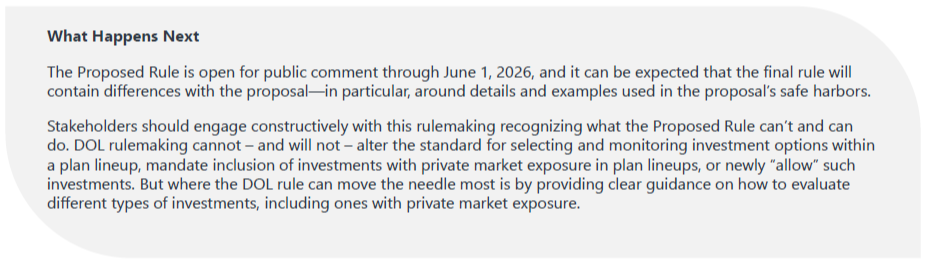 The Proposed Rule is asset-neutral and principles-based. It implements President Trump’s Executive Order 14330, Democratizing Access to Alternative Assets for 401(k) Investors, by providing specific guidance on what may be a prudent fiduciary process for considering and selecting investments with private market exposure and other alternative investments. Overall, the DOL’s goal for the Proposed Rule is to reduce litigation risk that the DOL perceives as constraining fiduciaries from offering investment opportunities that could improve participant outcomes.